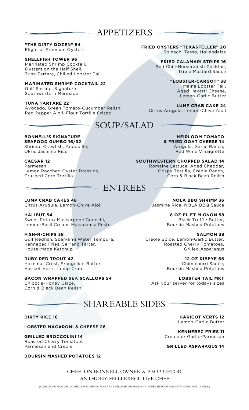 Add-ons:CREOLE GRILLED SHRIMP (2) $9 | GULF LUMP CRAB CAKE $22 | CREOLE GRILLED CHICKEN BREAST (6oz) $8